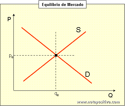 O preço de mercado (ou de equilíbrio) de determinado bem representa o preço que se forma no mercado (através do chamado mecanismo de mercado) e que compatibiliza os interesses antagónicos dos consumidores e dos produtores. Esta compatibilização é conseguida quando a quantidade procurada pelos consumidores é igual à quantidade oferecida pelos produtores, situação que se verifica quando o preço do bem é o seu preço de equilíbrio. Segundo a Teoria da Procura, quanto maior o preço do bem menor será a quantidade procurada; pelo inverso, segundo a Teoria da Oferta, quanto maior o preço do bem maior será a quantidade oferecida. Desta forma, existe apenas um preço em que as quantidades procuradas e oferecidas se igualam - é o chamado preço de equilíbrio. · No caso do preço estar acima desse preço de equilíbrio, a quantidade que os produtores oferecem é necessáriamente superior à quantidade que os consumidores procuram - verifica-se um Excesso de Oferta. Assim sendo, os produtores são levados a baixarem os preços de forma a conseguirem vender os seus produtos; · Pelo contrário, se o preço estiver abaixo do seu preço de equilíbrio, a quantidade procurada será superior à quantidade oferecida - verifica-se um Excesso de Procura. Neste caso, os produtores têm incentivos para aumentar os preços de forma a satisfazerem toda a procura. Conclui-se pelo exposto acima que o preço de mercado de um bem tende sempre para o seu preço de equilíbrio, ou seja, para o único preço em que as intenções de compra igualam as intenções de venda. Algebricamente, o preço de equilíbrio é encontrado juntando a função oferta e a função procura. De igual forma, o preço de equilíbrio também pode ser encontrado graficamente sobrepondo no mesmo gráfico a curva da oferta e a curva da procura. No gráfico abaixo, em que foram sobrepostas as curvas da oferta (S de Suply) e da Procura (D de Demand), facilmente se conclui que existe apenas um preço para o qual a quantidade oferecida é igual à quantidade procurada.
