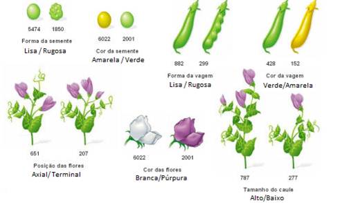 O local do cromossoma ocupado por um gene, é designado locus, assim, o carácter, por exemplo, “forma da semente” é determinado por dois alelos que se encontram num mesmo local correspondente (locus) em cromossomas homólogos. Os genes responsáveis por um determinado carácter constituem o genótipo (exemplo: LL, Lr, rr). A expressão de um determinado genótipo é responsável pelo carácter observável ou fenótipo, isto é o fenótipo é as características anatómicas, fisiológicas e bioquímicas que são observáveis, por exemplo, “sementes lisas” e “sementes rugosas”. Os resultados de Mendel são actualmente interpretados da seguinte forma: . Cada indivíduo da geração parental, sendo linhas puras, apresenta um genótipo formado por dois alelos iguais para um determinado carácter (PP ou pp para o caso da cor da corola das flores), chamando-se, por isso, homozigóticos para essas características. . Ao formarem gâmetas, cada um dos progenitores, por ser homozigótico para esta característica, apenas pode formar gâmetas com um tipo de alelo (P no caso das plantas com flor púrpura e p no caso das plantas com flores de corola brancas). . A união dos gâmetas da geração parental conduz à formação de indivíduos que constituem a geração F1, os quais possuem dois alelos diferentes para o carácter considerado (Pp), chamam-se por isso heterozigóticos. . Os indivíduos heterozigóticos, híbridos da primeira geração, originam gâmetas que são portadores do alelo P e outros que são portadores do alelo p . A autopolinização que ocorreu nos indivíduos de F1 pode conduzir à reunião de gâmetas portadores de formas alélicas iguais ou diferentes. Para facilitar a visualização das combinações possíveis de gâmetas, recorre-se ao xadrez mendeliano: