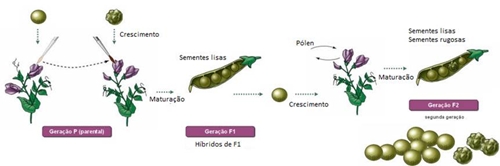 Fig. Características analisadas por Mendel Experiências de monoibridismo e segregação factorial Após a obtenção de linhas puras, Mendel efectuou cruzamentos parentais, isto é, cruzamentos entre indivíduos de linhas puras mas em que cada indivíduo, envolvido no cruzamento, apresentava uma forma antagónica para a característica em estudo. Mendel começou por cruzar indivíduos de uma geração parental (vulgarmente designada geração P), que eram linhas puras, mas detentoras de caracteres antagónicos (ex. sementes lisas vs sementes rugosas) – cruzamentos parentais.