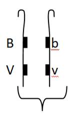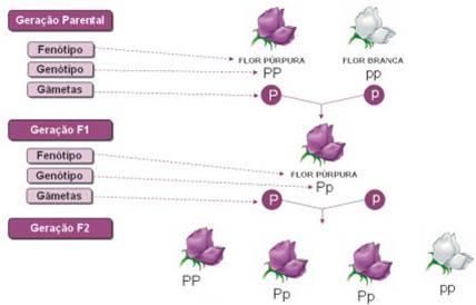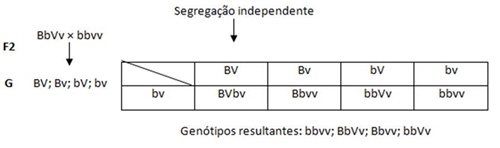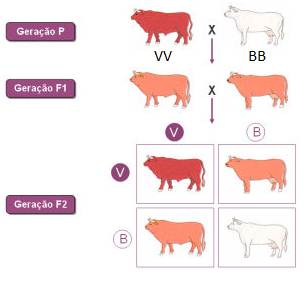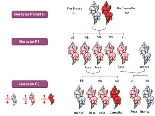 O cruzamento entre as linhas puras (VV x BB) originou uma descendência F1 uniforme, genotipicamente VB e com um fenótipo cor-de-rosa. A autopolinização de F1, originou 25% de plantas com flores vermelhas, 50% de plantas com flores cor-de-rosa e 25% de plantas com flores brancas, resultantes dos genótipos VV, VB, BB. Geração F3