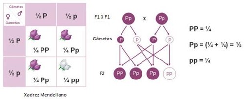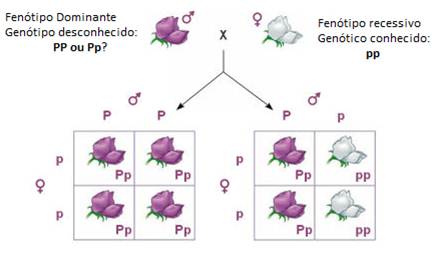 Os indivíduos da geração F1 são 100% heterozigóticos (Pp). Os indivíduos da geração F2 são: . 25% Homozigóticos dominantes (PP) . 50% Heterozigóticos (Pp) . 25% Homozigóticos recessivos (pp) . 75% Manifestam o fenótipo dominante; 25% manifestam o recessivo A análise do xadrez mendeliano permite fazer uma previsão teórica das proporções genotípicas dos indivíduos da geração F2. Na geração F2 podem surgir indivíduos com o mesmo fenótipo (corola púrpura), mas que podem ter dois genótipos diferentes (PP ou Pp), pois o alelo P sendo dominante, e ao estar presente, é o único que se manifesta. Cruzamento-teste ou retrocruzamento (teste à segregação factorial) Mendel procurou demonstrar que o fenótipo flores de cor púrpura, poderia aparecer de diferentes genótipos, por isso cruzou algumas ervilheiras com corola púrpura (de genótipo desconhecido) com ervilheiras de corola branca (homozigóticas recessivas).