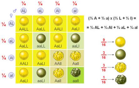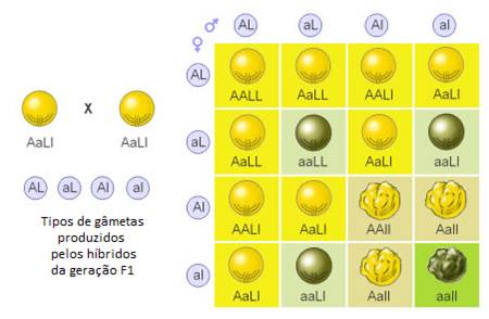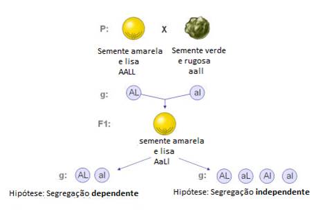 Segregação dependente: os alelos responsáveis pelos dois caracteres em estudo são transmitidos em bloco para os gâmetas, isto é, considerando que os dois caracteres são recebidos dos pais e transmitidos para a descendência sempre juntos (por exemplo: A com L e a com l). Segregação independente: os alelos responsáveis pelos dois caracteres em estudo são transmitidos de forma independente para os gâmetas, isto é, independentemente para os gâmetas, isto é, independentemente do conjunto de genes que foi herdado de cada progenitor, os indivíduos F1, ao produzirem os seus gâmetas podem combiná-los ao acaso, desde que cada gâmeta receba um alelo para a cor e a forma da semente. . A geração F2 revelou-se heterogénea, surgindo, além dos parentais, dois novos fenótipos (verde/liso e amarelo/rugoso).