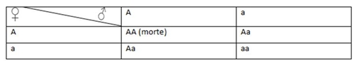 Constata-se que o grupo sanguíneo O, pode doar sangue para os demais grupos sem reacção de incompatibilidade, é denominado doador universal e o AB, por receber sangue dos demais grupos, é denominado receptor universal. Alelos Letais Nas variadas espécies, existem determinados alelos que, quando se reúnem em homozigotia, podem conduzir à morte do seu portador, sendo, por isso, designados alelos letais. Em heterozigotia tais alelos não são letais o que permite a sua manutenção na população. Os seus efeitos podem manifestar-se logo no desenvolvimento embrionário ou após o nascimento. Cor do pêlo dos gatos: . Preto (recessivo) a . Amarelo (dominante) A