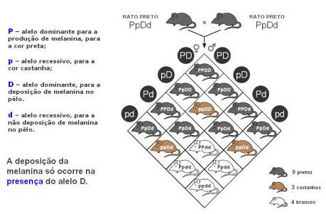 Os cruzamentos que envolvem genes letais podem conduzir a alterações nas proporções fenotípica observadas em relação às esperadas de acordo com os princípios de Mendel. Este facto resulta da morte de indivíduos portadores do gene letal em homozigotia (no caso AA) antes de completarem o seu desenvolvimento embrionário. Nesta situação, ¼ dos embriões não chega a nascer e , assim, dos sobreviventes. 2/3 terão fenótipo de cor de pêlo amarelo e 1/3 terá a cor do pêlo preto. Uma forma de evitar a ocorrência de embriões mortos devido à presença dos alelos letais em homozigotia é realizar cruzamentos entre progenitores em que apenas um deles seja portador do gene letal (Aa x aa). Desta forma, irão nascer indivíduos heterozigóticos (Aa) e indivíduos homozigóticos normais (aa). Interacção génica – epistasia Nos casos que têm sido apresentados têm sidos explorados até ao momento, o fenótipo resultava da expressão de um único gene. Contudo, são diversas as situações em que dois ou mais genes não alélicos interactuam para produzir uma determinada característica fenotípica de um gene de um segundo locus, isto é, um gene de um determinado locus altera a expressão fenótipica de um gene de um segundo locus. Esta situação é denominada epistasia.