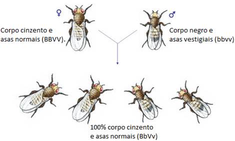Geração Parental Fêmea – Corpo cinzento e asas normais (BBVV). Origina gâmetas BV Macho – Corpo negro e asas vestigiais (bbvv). Origina gâmetas bv