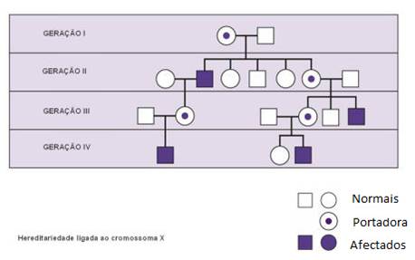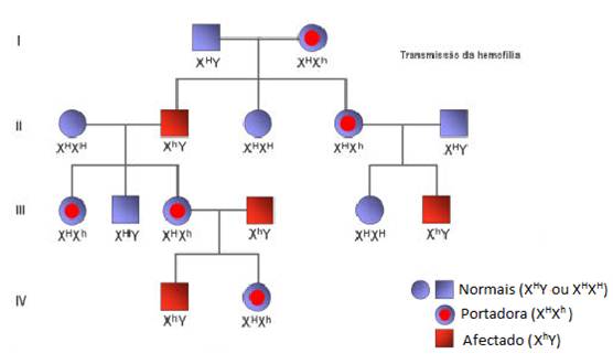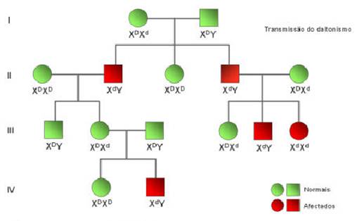 Actualmente, conhece-se mais do que um tipo de hemofilia. Contudo, as duas formas mais frequentes de resultam de genes recessivos localizados no cromossoma X. Considere-se a seguinte simbologia: h- gene responsável pela hemofilia; H- gene normal. Dado que estão localizados no cromossoma X, a representação deverá ser Xh e XH, respectivamente. À semelhança do que acontece com outras anomalias resultantes da expressão de genes localizados no cromossoma X, verifica-se que afecta quase exclusivamente os homens. Porquê? Uma mulher só será hemofílica se possuir o gene mutante em homozigotia, o que significa que ambos os pais tem de ter um gene com essa doença; além disso admite-se que os gens de hemofílica em homozigotia levam à morte dos embriões. No caso da Rainha Vitória que passou a doença a toda a sua família, a doença não deixou de existir ao longo das gerações pelo facto de ocorrer um elevado número de cruzamentos consanguíneos entre as famílias reais, o que contribui para a manutenção e manifestação da doença. Daltonismo O daltonismo constitui outro exemplo de uma anomalia hereditária resultante de um alelo localizado no cromossoma X. Os indivíduos que manifestam esta anomalia não são capazes de distinguir cores, por exemplo, o verde do vermelho.