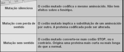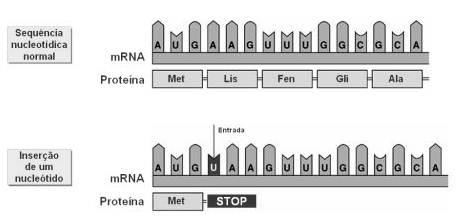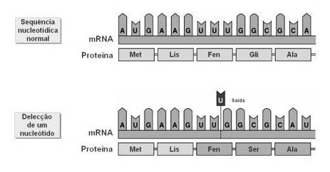 Noutros casos, a molécula de DNA perde (delecção) ou ganha (inserção) um nucleótido, alterando-se por completo a mensagem a partir do codão onde ocorreu a mutação.
