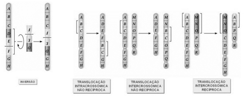 . Inversão – rotação de 180º de um segmento cromossómico em relação à posição normal, com inversão da ordem dos genes Exemplos de mutações cromossómicas estruturais: