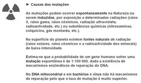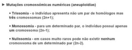 Durante a meiose pode ocorrer quer uma não – disjunção de cromossomas homólogos na divisão I, quer uma não disjunção de cromatídeos na divisão II. De ambos os casos resultam células com excesso ou com défice de cromossomas. A não disjunção pode envolver cromossomas autossómicos como os cromossomas sexuais. Na espécie humana são raras as aneuploidias que envolvem autossomas e que sejam compatíveis com a vida, sendo que acontecem abortos. Lê – página 163-165 Causas das mutações (depois no livro explica a formação de cancro! Como é tudo importante é mais fácil leres J - página 153-158)