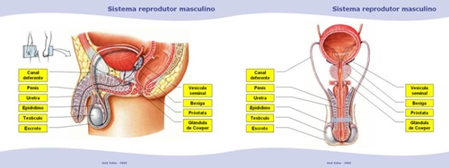 Os homens possuem dois testículos, cada um deles constituído por numerosos tubos seminíferos enrolados, rodeados por várias camadas de tecido conjuntivo (cápsula fibrosa), que dá origem a vários septos, dividindo os testículos em vários lóbulos. Cada lóbulo testicular contém dois ou três tubos seminíferos enovelados, nos quais ocorre a produção de espermatozóides. Os tubos seminíferos convergem para a zona posterior dos testículos formando a rede testicular, de onde saem cerca de 15 canais que se vão ligar ao epidídimo. Nos tubos seminíferos existem células somáticas, dentro das quais: . Células de Sertoli são responsáveis pela coesão, protecção e nutrição das células germinativas e pela coordenação da espermatogénese. . Células de Leydig ou intersticiais são responsáveis por produzirem entre outras hormonas, a testosterona, responsável pelo aparecimento dos caracteres sexuais secundários do Homem. Vias genitais: . Canal deferente tem a função de conduzir os espermatozóides e receber o líquido seminal ; . Uretra tem a função de conduzir a urina e os espermatozóides para o exterior; . Epidídimos, tem a função de armazenamento e maturação dos espermatozóides.