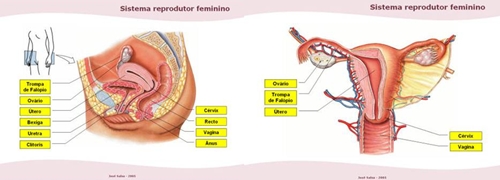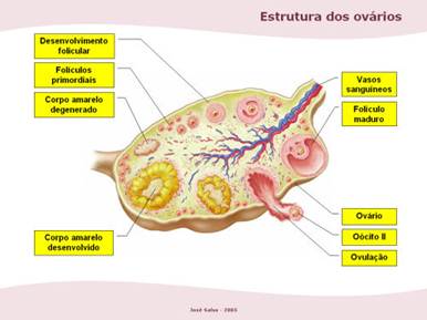 Os folículos são formados por uma célula germinativa, que irá dar origem ao gâmeta, rodeada por uma ou mais camadas de células foliculares, que alimentam e protegem a célula germinativa ao longo do seu amadurecimento. Processo da passagem do gâmeta do ovário para o pavilhão da trompa: Existem cílios vibráteis no pavilhão interior da trompa de Falópio que provocam o movimento de líquido da cavidade abdominal para a trompa, facilitando, assim, a recolha do gâmeta feminino para o interior do oviduto e a sua condução ao longo deste tubo, em direcção ao útero. O útero é um órgão musculoso e elástico, cuja camada interior (endométrio), é muito vascularizada. A parte superior mais dilatada constitui o corpo uterino. A parte inferior, mais estreita, forma o colo uterino ou cérvix e contacta com a vagina. Função do útero: é nele se que acomoda o embrião e mais tarde o feto durante a gestação. Vagina: é um canal musculoso, muito elástico. Termina na vulva e serve como deposito de sémen, durante o ato sexual. Também constitui o canal pelo qual se dá o nascimento. Glândulas de Bartholin: segregam um muco destinado à lubrificação do vestíbulo. Evolução dos folículos ováricos A evolução dos folículos ováricos e a oogénese são fenómenos que ocorrem simultaneamente e têm inicio durante o desenvolvimento embrionário da mulher. Na zona cortical ou córtex ovárico diferenciam-se os folículos, que resultam da multiplicação de células germinativas, as oogónias. Cada folículo demora 4 meses até atingir a fase madura. Folículo primordial Este folículo é constituído por uma célula germinativa (ovócito ou oócito), rodeada por células foliculares. Atresia folicular: degeneração de folículos parte deles antes do nascimento. Folículo primário O oócito I a partir da puberdade, começa a crescer uma vez por mês, aumenta de volume e verifica-se uma proliferação das células foliculares, até formarem uma camada contínua de células. Folículo secundário Continua o aumento do oócito I e proliferação das células foliculares, originando a camada granulosa. Entre essa camada e o oócito I forma-se uma outra, mas acelular denominada zona pelúcida. Surge ainda um 3º camada que rodeia o folículo, a teca. Folículo terciário O oócito continua a aumentar de tamanho e as células da camada granulosa continuam a proliferar, começando a apresentar cavidades preenchidas com um líquido. A teca diferencia-se em teca externa e interna. Folículo maduro ou de Graaf As cavidades existentes na camada granulosa continuam a aumentar de tamanho até originar uma só cavidade cheia de líquido folicular, a camada folicular. Esta cavidade fica rodeada por uma camada granulosa, que inclui um conjunto de células a rodear o oócito II, pronto a ser libertado. O crescimento do folículo de Graaf causa uma saliência na superfície do ovário, que acaba por causar a ruptura e libertar o oócito II para a trompa de falópio, num processo denominado ovulação. Após a ovulação, a parede do ovário cicatriza. As células foliculares que permanecem no folículo, proliferam, aumentam de tamanho e adquirem função secretora. O citoplasma destas células é amarelo, devido à presença de um pigmento dessa cor, pelo que o conjunto de células se designa corpo amarelo ou lúteo, se não ocorrer fecundação este degenera.