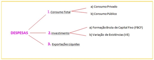 DESPESA INTERNA : Gastos efectuados pelas unidades institucionais no interior da sua fronteira económica e em relação à sua produção interna (daí incluir o valor das exportações mas não o valor das importações). Assim : DI = Consumo Privado + Consumo Público + FBCF + VE + Exportações – Importações DI = CONSUMO TOTAL + INVESTIMENTO + EXPORTAÇÕES LÍQUIDAS DI = PIB pm DESPESA NACIONAL : Se ao valor da despesa interna juntarmos também o saldo das despesas com o exterior, isto é, SRRM, obtemos a despesa nacional. DN = DI + SRRM DN = PNB pm PROCURA INTERNA (PI) : Corresponde aos gastos realizados pelos residentes em relação à produção efectuada exclusivamente nesse território económico. . PI = Consumo + Investimento . PI = Consumo público +Consumo Privado + FBCF +VE PROCURA GLOBAL (PG): Se à procura interna acrescentarmos a procura efectuada pelos não residentes em relação aos bens e serviços nacionais obtemos a procura global. . PG = PI + Exportações Consumo privado + Consumo público + FBCF + VE ..................................... PI (Procura Interna) + Exportações ..................................... PG (Procura Global) - Importações ..................................... DI (Despesa Interna) + SRRM ..................................... DN (Despesa Nacional)