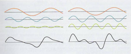 Timbre . Permite distinguir dois sons com a mesma intensidade e a mesma frequência, mas produzidos por instrumentos diferentes. . O timbre resulta da combinação do som fundamental e dos seus harmónicos. . O nº de harmónicos que intervêm e a proporção em que cada um entra no som resultante dão características únicas ao som de um instrumento musical ou da voz humana. . Combinações do mesmo som fundamental e dos dois primeiros harmónicos, todos com amplitudes diferentes (à esquerda e à direita). . O som resultante é diferente do lado esquerdo e do lado direito.