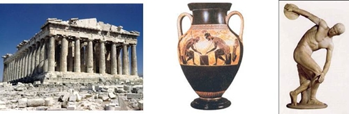 As crianças, até aos 7 anos, estavam ao cuidado das mães, no gineceu. A partir desta idade os rapazes eram mandados para a escola onde aprendiam a ler, a escrever, aritmética, música, canto e a recitar poemas bem como exercício físico. A partir dos 15 aprendiam a oratória, arte de discursar. Dos 18 aos 20 havia a preparação militar e começavam a participar na vida política. A Arte Grega A arte grega atingiu o seu apogeu no séc V a.C. Neste período, as obras dos artistas gregas alcançaram tal perfeição que se tornaram um modelo para muitos artistas de épocas posteriores. Era o chamado período clássico. O que caracteriza a arte clássica é a harmonia e o equilíbrio e o enaltecimento do Homem. A arquitectura grega, apesar de ser sobretudo exclusiva da vida religiosa foi feita à medida do Homem ou seja os edifícios eram grandes mas nunca atingiam dimensões esmagadoras. Os templos gregos eram geralmente rectangulares e tinham como elemento básico da construção as colunas nas quais assentava a cobertura. Os templos obedeciam a duas ordens: a ordem dórica (mais severa e sóbria) e a ordem jónica (mais ornamentada). Os Gregos esculpiram estátuas de deuses e de atletas bem como altos-relevos e baixos-relevos representado cenas mitológicas e procissões e enalteciam sobretudo a beleza física e espiritual do homem com muita naturalidade As esculturas eram de uma enorme perfeição representando o corpo com grande naturalidade e nas proporções perfeitas. Em relação à pintura, no séc VI a.C., os Gregos pintavam magníficos desenhos em vasos de cerâmica onde se destacavam as figuras negras em fundos vermelhos, mas a partir do século V a.C., começaram a pintar em tons de vermelho e dourado que permitia realçar os pormenores e o brilho do desenho.