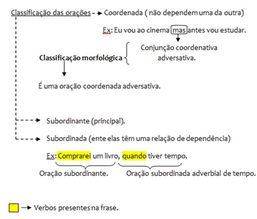 Vai + ser (verbo principal no infinitivo). Verbo auxiliar: Vão + marcando (verbo principal no gerúndio). 18) Modo indicativo . Presente – hoje . Pretérito perfeito – ontem . Pretérito imperfeito – dantes . Pretérito - mais - que -perfeito – [-ra (terminação)] . Futuro – amanhã Modo conjuntivo – . Presente – a minha mãe quer que eu… . Pretérito imperfeito – se… (-ss) . Futuro – se… {se eu amar / se tu amares… } 19) Acção {encaixe} Acção: Estrutura Encaixe (histórias secundárias) ↓ Inclusão de uma acção na outra, (geralmente existe o retomar da primeira acção) 1º História . 20) Coordenação Frase – conjunto organizado de palavras com sentido próprio. Oração – unidade gramatical organizada á volta de um verbo, dentro de uma frase. Frase Simples – É aquela que é constituída por uma única oração, contendo por isso um só verbo conjugado. Frase complexa – É aquela que é constituída por duas ou mais orações (apresenta portanto + que um sujeito e + que um predicado). a) As orações coordenadas sindéticas i as assindéticas. As orações coordenadas sindéticas são ligadas por conjunções coordenativas. Exemplos Eu comi um bolo e um chocolate e batatas fritas.Eu comi um bolo, um chocolate, batatas fritas. b) Orações coordenadas assindéticas. Acontecem quando se justapõem umas às outras sem o auxílio de conjunções. Exemplo: Eu comi um bolo, um chocolate, batatas fritas. 21) A Subordinação As orações subordinadas têm entre si uma relação de dependência (oração subordinante = principal; oração subordinada só tem um sentido em relação á subordinante) Estas orações ligam-se com um conjunção e locução subordinativas. . Orações são subordinadas . Conjunções e locuções são subordinativas. Orações subordinadas causais e temporais ( já foram leccionadas). Finais: . Condicionais . Comparativas . Concessivas . Consecutivas a. Compraremos um carro, quando tivermos dinheiro.
