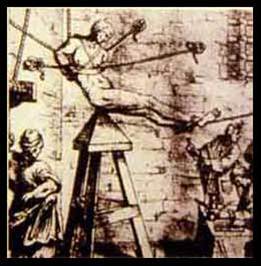 Tortura da água Ao réu, preso à mesa, durante o "interrogatório" era dada água até o seu ventre se partir
