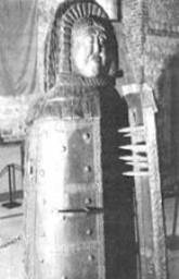 A dama de ferro Um sarcófago de madeira com espinhos afiados e longos. Essa ferramenta de tortura tinha os espinhos colocados de tal forma que não atingia nenhum ponto vital das vítimas, para prolongar seu sofrimento.