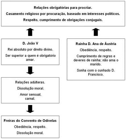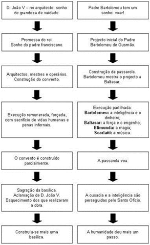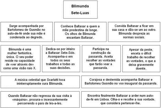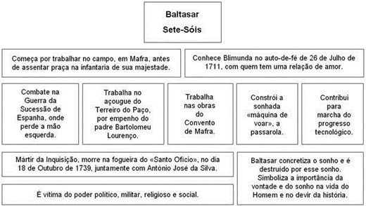 Personagens No Memorial do Convento existem personagens históricas (como D. João V, D. Ana Maria Joseha, Padre Bartolomeu Lourenço de Gusmão e Domenico Scarlatti) e pe rsonagens fictícias (Baltasar Mateus e Blimunda de Jesus). D. João V D. João V é rei de Portugal de 1706 a 1750. De carácter vaidoso, magnificente e megalómano pretende deixar uma obra que ateste a grandeza da sua riqueza e do seu poder – Convento de Mafra -, ainda que para tal se tenha que sacrificar o povo (sacrificou todos os homens válidos e a riqueza do país). Este é construído sob o pretexto de que cumpre uma promessa feita (se no espaço de um ano a sua mulher lhe desse um filho varão este construiria o convento). É um “marido leviano”, cuja relação com a rainha se rege, essencialmente, pelo cumprimento de “deveres reais e conjugais”. Dado aos prazeres da carne e a destemperos vários (teve muitos bastardos e a sua amante favorita era a Madre Pauta do Convento de Odivelas). A caracterização do rei é feita predominantemente através da descrição das suas acções e dos seus pensamentos – de modo indirecto. Durante algum tempo apoiou o projecto do Padre Bartolomeu Gusmão (a “passarola”). D. Ana Maria Josefa De origem austríaca, a rainha, surge como uma pobre mulher cuja única missão é dar herdeiros ao rei para glória do reino e alegria de todos, vive um casamento baseado na aparência, na sexualidade reprimida e no falso código ético, moral e religioso. A rainha representa a mulher que só pelo sonho se liberta da sua condição aristocrática para assumir a sua feminilidade, sentindo uma atracção incestuosa pelo cunhado D. Francisco. É símbolo do papel da mulher da época: submissa, simples procriadora, objecto da vontade masculina. Padre Bartolomeu Lourenço de Gusmão O padre Bartolomeu, tem por alcunha “O Voador”, vive com a obsessão de “elevar-se um dia no ar, onde até agora só subiram Cristo, a Virgem e alguns santos eleitos", daí o seu projecto da “passarola”, apoiado por el-rei D. João V, que mostra-se muito empenhado no progresso do seu invento. Mantém laços de profunda amizade com Baltasar e Blimunda, que formam o trio que vai pôr em prática o sonho de voar, e com quem, segundo as suas palavras, formam “uma trindade terrestre, o pai, o filho e o espírito Santo (XVI)”. Assim, o trabalho físico e artesanal, de Baltasar, liga-se à capacidade mágica de Blimunda e aos conhecimentos científicos do padre. Acaba por ter de se refugiar em Toledo (Espanha) devido à perseguição da Inquisição, que o acusa de bruxaria, por isso deixa o seu sonho/projecto nas mãos de Baltasar. A sua obsessão de voar domina-o de tal forma, que ele não se inibe de integrar no seu projecto um casal não abençoado pela Igreja e de aceitar e usufruir das capacidades heréticas de Blimunda (“bruxaria”), que farão a passarola voar. A passarola, símbolo da concretização do sonho de um visionário, funciona de uma forma antagónica ao longo da narrativa: é ela que une Baltasar, Blimunda e o padre Bartolomeu, mas também é ela que vai acabar por separá-los. A sua caracterização é feita predominantemente de forma indirecta. Domenico Scarlatti É um músico italiano, que veio para Portugal como professor do irmão de D. João V, o infante D. António, passando depois a ser professor da infanta D. Maria Bárbara. É um homem de completa figura, rosto comprido, boca larga e firme, olhos afastados (XVI). Scarlatti é cúmplice silencioso do projecto da passarola ("Saiu o músico a visitar o convento e viu Blimunda, disfarçou um, o outro disfarçou, que em Mafra não haveria morador que não estranhasse, e (...) fizesse logo seus juízos muito duvidosos"). Na história, a sua música tem poderes curativos que libertaram Blimunda da sua estranha doença, permitindo-lhe cumprir a sua tarefa de recolher as “vontades” ("Durante uma semana (...) o músico foi tocar duas, três horas, até que Blimunda teve forças para levantar-se, sentava-se ao pé do Cravo, pálida ainda, rodeada de música como se mergulhasse num profundo mar, (...) Depois, a saúde voltou depressa" ). É, ainda, Scarlatti que dá a notícia a Baltasar e Blimunda da morte do padre Bartolomeu. A música do cravo de Scarlatti simboliza o ultrapassar, por parte do homem, de uma materialidade excessiva, e o atingir da plenitude da vida. Blimunda de Jesus Blimunda de Jesus (19 anos) é "baptizada" de Sete-Luas pelo padre Bartolomeu de Gusmão ("Tu és Sete-Sóis porque vês às claras, (...) Blimunda, que até aí só se chamava, como sua mãe, de Jesus, ficou sendo Sete-Luas, e bem baptizada estava, que o baptismo foi de padre, não alcunha de qualquer um" ). Conhece Baltasar quando assiste ao auto-de-fé de sua mãe, acusada de feitiçaria. Rapidamente os dois se apaixonam, e este amor puro e verdadeiro foge às normas da época. Blimunda tem um dom: vê o interior das pessoas, herdou da mãe um "outro saber" e integra-se no projecto da passarola, porque, para o engenho voar, era preciso "prender" vontades, coisa que só Blimunda, com o seu poder mágico, era capaz de fazer. Blimunda é, simultaneamente, uma personagem que releva o domínio do maravilhoso, pelo dom que tem de ver "o interior" das pessoas (poder que nunca exerce sobre Baltasar - "Nunca te olharei por dentro"-, porque segundo ela, amar alguém é aceitá-lo sem reservas). É Blimunda e Baltasar que guardam a passarola enquanto o padre Bartolomeu foge para Espanha. Após uma aventura voadora, a “passarola” ficou danificada e estes remendaram-na, compuseram-na e limparam-na. Após o desaparecimento de Baltasar, Blimunda procurou-o durante 9 anos, infeliz de saudade, até que na sua sétima passagem por Lisboa, encontrou-o entre os crucificados da Inquisição, a arder numa das fogueiras, e, graças aos seus poderes, impediu que a sua vontade (alma) subisse às estrelas, guardando-a como se fosse sua. Simbolicamente, o no