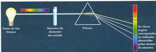 Efeito térmico. Todas têm efeito térmico, mas as vermelhas são mais caloríficos embora as violetas sejam mais energéticas. Fora do visível temos a energia do microondas, pouco energética, mas muito calorífica. Espectro – É o conjunto das radiações emitidas ou absorvidas por um determinado material. Espectros contínuos de emissão Quando os átomos estão muito próximos, como acontece num sólido ou na matéria densa de uma estrela, os electrões dos vários átomos realizam saltos energéticos com valores de energia extremamente próximos. Libertam radiações com energias muito próximas, dando origem a um espectro contínuo com todas as cores. – Porque são emitidos (pela fotoesfera – camada superficial) Contínuos – porque são ininterruptos (todas as cores, todas as radiações). . Os corpos incandescentes também emitem radiações (vermelhas, esbranquiçadas, azuis, conforme a temperatura. . Os corpos apresentam a cor que emitem. . O corpo humano tb. emite radiações no infravermelho. Não se vêm, só em fotografias de I.V. Conforme a temperatura (energia) mais alta ou mais baixa, mais o espectro está deslocado para os vermelhos ou azuis e maior a energia da radiação emitida. Espectro contínuo – espectro elec.magnét. que apresenta todas as energias presentes na luz branca. Lâmpadas de incandescência, de halogéneo, metais ao rubro (emitem radiações vermelhas), espectro solar. Espectros contínuos de emissão. Espectros térmicos das estrelas As estrelas têm cores diferentes, umas emitem cor avermelhada, outras esbranquiçada, outras verdes, azuis e violetas, conforme a temperatura vai aumentando. Vemos com um espectroscópio. Podem ir dos 3500K (amarelo-claro) até aos 40000K (branco azulado). O nosso Sol é uma estrela amarela (6000K). Quanto maior a temperatura, maior a luminosidade. As estrelas, da mais fria à mais quente, podem ter as cores: amarelo clara, laranja, Branca, vermelha, azul, amarela, azul clara. Espectros de emissão de riscas (descontínuos) Se os átomos estiverem suficientemente separados como acontece no estado gasoso, as forças de interacção entre eles são pequenas, os electrões estão afastados e se eles estiverem a pressão reduzida emitem um conjunto de linhas finas sobre um fundo escuro, submetidos a descargas eléctricas. Ex: espectro de emissão do H, do He, do Na (2 riscas amarelas), etc. Ex: H – 4 riscas (vermelha, azulada, anil, violeta) Na – 2 amarelas – também se podem obter através do ensaio de chama; potássio – violeta; bário – verde, estrôncio – vermelho. Aplicações: lâmpadas fluorescentes, lâmpadas de vapor de sódio (candeeiros de iluminação pública, Néons (reclamos luminosos), ensaios de chama. Espectro atómico – espectro de riscas produzido quando átomos emitem radiações. Os atómicos são sempre de riscas. Submetendo a descargas eléctricas os gases rarefeitos emitem luz, característica do gás em questão. O néon dá cores azul ou vermelho (anúncios luminosos). Outras cores como o verde são produzidas por revestimentos especiais no interior dos tubos. Espectros: com um espectroscópio, vê-se um conjunto de riscas coloridas com um fundo escuro.