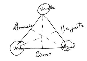 Há passagem de corrente pois a acção da luz sobre o metal provoca efeito fotoeléctrico e o fluxo de electrões removidos vai completar o circuito. Cores dos objectos Há as cores primárias (vermelho, verde e azul) e as cores secundárias (opostas, estão do outro lado da roda das cores). São ciano (azul turqueza) oposto de vermelho, magenta (avermelhado) , oposto do verde e amarelo oposto de azul.