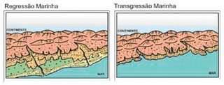 2.1 – Transgressões e regressões Transgressões – São avanços do nível do mar relativamente à linha da costa. A sedimentação neste tipo de zonas ocorre da seguinte forma: . Na base os grãos mais grosseiros (calhaus, seixos e areias grossas) e no topo depositam-se os grãos mais finos (areias finas, silte e argilas) - POSITIVA Regressões – São recuos do nível do mar relativamente à linha de costa. A sedimentação neste tipo de zonas ocorre da seguinte forma: . Na base os materiais mais finos, e no topo os mais grosseiros – NEGATIVA