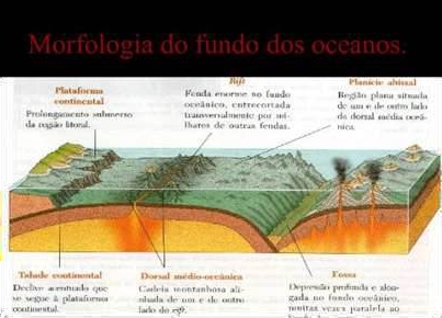 Argumentos Geodésicos – A geodesia estuda a forma, o tamanho e a localização precisa de pontos na Terra. Wegener baseou-se em medições que efectuo em pontos distintos, num determinado período de tempo, em duas ilhas da Gronelândia em expedições que realizou. Com base nessas medições calculou um afastamento entre estas ilhas de 11 a 21 m/Ano. Crítica à Teoria da Deriva dos Continentes – Wegener não conseguiu impor a sua teoria no meio da comunidade científica. A principal crítica foi o motor proposto para explicar o movimento dos continentes. Em relação aos argumentos geológicos, os opositores de Wegener defendiam que a correspondência entre as costas do Atlântico não era tão efectiva como ele referia. Existiram críticos que sugeriram mesmo uma distorção na forma dos continentes e das formações montanhosas de ambos os lados do Atlântico a fim de justificar a sua ligação no passado. Os argumentos geodésicos também foram alvo de refutação, nomeadamente quanto aos diferentes valores encontrados e à fiabilidade dos métodos utilizados, uma vez que a velocidade de transmissão das ondas rádio depende das condições meteorológicas. Em 1930, Wegener voltou à Gronelândia com o objectivo de esclarecer estas ambiguidades e de confirmar o deslocamento horizontal; porém, veio a morrer durante esta expedição. 1.3 – Os primeiros passos de uma nova teoria – a teoria da Tectónica de Placas Morfologia dos fundos oceânicos – Montanhas submarinas, vulcões, alguns dos quais originaram ilhas vulcânicas, e zonas de grande profundidade designada por fossa oceânica. Maior cadeia montanhosa encontra-se submersa e designa-se por Dorsal médiooceânica. No centro dessa cadeia montanhosa encontra-se um vale de rifte, onde existe actividade vulcânica constante. Existe uma área com cerca de 5000 metros de profundidade designada por planície abissal.