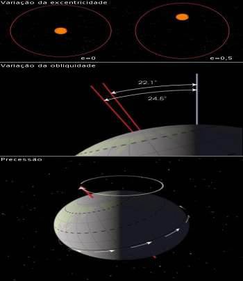 Factores que influenciam as variações climáticas - Devido às influências gravitacionais dos outros planetas do sistema solar ao longo dos tempos milenares vão-se modificando ciclicamente diversos parâmetros astronómicos do movimento terrestre como sejam: 1 - Precessão dos equinócios: - É variável, ao longo do tempo, a relação entre o instante dos equinócios e dos solstícios relativamente ao instante de maior ou menor distância da Terra ao Sol; 2 - Excentricidade da órbita: - É variável, ao longo do tempo, a forma ligeiramente elíptica da órbita terrestre; 3 - Obliquidade do eixo: - É variável, ao longo do tempo, a inclinação do eixo de rotação da Terra em relação à eclíptica. A combinação dos três ciclos de variação destes parâmetros, com as suas diferentes periodicidades e intensidades, produz variações complexas entre a quantidade de radiação solar interceptada em cada latitude e em cada estação do ano. Milankovitch assume que a energia solar incidente globalmente na Terra durante um ano inteiro é sempre a mesma, excepto nas mudanças de excentricidade em que admite um pequeno desvio. A variação importante reside na diferente repartição sazonal da energia em cada hemisfério, ao mesmo tempo que vão variando as características da órbita ao longo dos anos. É de interesse registar que cada um dos três ciclos de Milankovitch pode provocar efeitos climáticos diferentes em cada latitude do planeta.