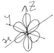 Quanto mais escura está a zona da nuvem, maior a possibilidade de encontrar o electrão. A nuvem é constituída por orbitais, com diferentes formas e com diferentes energias. Há 3 formas de orbitais. Para caracterizar uma orbital, são necessários 3 parâmetros: 1) n – nº quântico principal 2) l - nº quântico secundário, azimutal ou momento angular 3) ml – nº quântico magnético 1) significa o nº do nível (distância média ao núcleo); n=1, 2, 3 até 7 não completo. 2) L- significa a forma da orbital (0 a n-1) Se n=1; l=0 a orbital é esférica – s (simetria esférica) – o tamanho aumenta com o n. Se n=2; l=0 a orbital é esférica – s; l=1 a orbital é em forma de lóbulo ou altere – p 3) ml – relacionado com a orientação da orbital. Vai de –l a +l Ex: para l=0; ml= 0; Para l=1; ml= -1; 0; +1 3 orbitais segundo os 3 eixos coordenados px; py; pz para l=2, as orbitais são do tipo d e têm a forma de chupeta. Para l=2 ml= -2; -1; 0; +1; +2; (vai de -2 a +2). Cada nível começa sempre numa orbital s, a partir do nível 2 tem orbitais p e a partir do nível 3 tem orbitais s, p e d. Há uma orbital s, 3 orbitais p, 5 orbitais d, 7 orbitais f, etc. Cada orbital só pode ter 2 electrões, logo a orbital s tem 2 e-, as orbitais p têm 6 e-, as orbitais d têm 10 e-, etc. As orbitais s têm simetria esférica, o conjunto das orbitais p, têm também simetria esférica (ao lado).