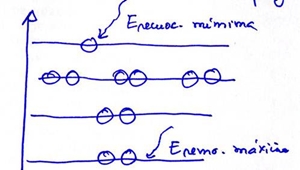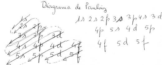 Estão aqui representados os 3 princípios ou regras. A ordem de preenchimento das orbitais em átomos polielectrónicos é: 1s, 2s, 2p, 3s, 3p, 4s, até ao cálcio de nº atómico 20. A partir daí, se o átomo tem mais de 20 e- , tem que seguir o diagrama de Pauling.