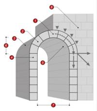 Tipos de Arco . Arco acairelado: decorado a cairéis ou lóbulos de pequenas dimensões. . Arco adintelado: com intradorso horizontal em forma de lintel, mas em que as aduelas são de formação radial. . Arco abatido (asa de cesto, sarapanel, rebaixado): possui uma forma achatada em que o valor da flecha é inferior à metade do raio. É composto de três curvas de centros diferentes.