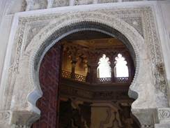 Arco em ferradura no castelo de La Aljafería em Espanha. . Arcos Geminados: arcos reunidos dois a dois por um outro arco maior ou por coluna, tendo um capitel comum. . Arco lanceolado: como o nome indica de forma similar à extremidade de uma lança.