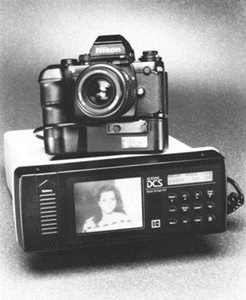 Figura 7 – 1ª câmara digital Na fotografia digital, a luz sensibiliza um sensor, chamado de CCD ou CMOS, que por sua vez converte a luz em um código electrónico digital, uma matriz de números digitais (quadro com o valor das cores de todos os pixels da imagem), que será armazenado em um cartão de memória. Tipicamente, o conteúdo desta memória será mais tarde transferido para um computador. Já é possível também transferir os dados diretamente para uma impressora gerar uma imagem em papel, sem o uso de um computador. Uma vez transferida para fora do cartão de memória, este poderá ser apagado e reutilizado