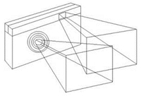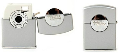 Figura 15 - Câmara Pinhole O princípio de uma máquina fotográfica de pinhole é que os raios de luz de um objeto passam por um pequeno buraco para formar uma imagem. A câmara pinhole consiste numa maneira de ver uma imagem real, através de uma câmara escura. De um pequeno orifício onde a luz é captada para dentro da câmara, e sofrendo um movimento de inversão, a imagem é projectada para a parede oposta ao orifício ao contrário. Para produzir uma imagem razoavelmente nítida, a abertura tem que ser um furo pequeno na ordem de 0,5 mm ou menos. O obturador da câmera pinhole geralmente consiste de uma mão espalmada ou de algum material à prova de luz para cobrir e descobrir o furo. As câmaras pinhole requerem um tempo maior de exposição do que as câmeras convencionais devido à pequena abertura; os tempos de exposição vão de 5 segundos a até mais de uma hora. Câmaras curiosas Quem gosta de isqueiros pode comprar a câmara fotográfica inspirada nos modelos Zippo. A Zippo Digital Câmera permite tirar fotos de maneira discreta, seu formato de isqueiro engana qualquer pessoa, principalmente se a câmara estiver fechada. Custa por volta de 100 dólares, possui conexão USB, timer e faz fotos contínuas. Com 64mb, ela armazena 30 fotos 640×480, ou até 100 fotos 320×240. Funciona apenas com uma pilha AAA.