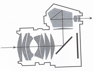 Figura 10 - Erro de paralaxe Câmara reflex É um tipo de câmara em que o que se vê no visor é a imagem exactamente como ela será capturada no filme. Isto graças a um espelho inclinado a 45 graus que reflete a imagem vinda da lente da câmara para uma malha do visor, o que acontece antes de se fazer a exposição, daí o nome reflex. O único inconveniente é que no exato momento em que se aperta o disparador da máquina, o visor se torna escuro e impossibilita de se ver qualquer imagem.