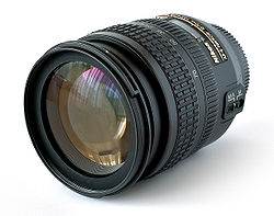 Figura 24 - Objectiva As objectivas podem estar embutidas no corpo da câmara, como numa câmara compacta, ou podem ser intermutáveis, como em câmaras SLR. A objectiva permite controlar a intensidade da luz que a atravessa, abertura, através do diafragma, permitindo maiores ou menores exposições à luz. A abertura é medida em números. Os números maiores correspondem a menores aberturas. A distância focal (medida em milímetros) de uma objetiva indica o seu grau de ampliação da imagem e o seu ângulo de visão. Uma objectiva de 50 mm, é uma objectiva normal e corresponde aproximadamente ao angulo de visão do olho humano. Todas as distancias focais abaixo de 50 mm são consideradas grande angular, pois oferecem um maior ângulo de visão, e todas as distâncias focais acima dos 50 mm são consideradas teleobjectiva, pois têm um angulo de visão inferior e aproximam a imagem. As objectivas podem ter apenas uma distância focal, comumente chamadas de "focal fixa" ou simplesmente "fixas", ou permitir um intervalo de distâncias focais, como por exemplo 28-80 mm. Estas últimas denominam-se Diafragma fotográfico O diafragma fotográfico é o dispositivo que regula a abertura de um sistema óptico. É composto por um conjunto de finas lâminas justapostas que se localiza dentro da objectiva, e que permitem a regulação da intensidade de luz/iluminada que ira sair na material foto-sensível O valor do diafragma se dá através de números, conhecidos como números f ou f-stop, e seguem um padrão numérico universal. Esta escala inicia -se em 1, 1.4, 2, 2.8, 4, 5.6, 8, 11, 16, 22, 32, 44, 64 etc, sendo que, quanto menor for o número f, maior a quantidade que luz que ele permite passar e, quanto maior o número f, menor a quantidade de luz que passará pelo diafragma. Cada número maior, ou seja, mais fechado, representa a metade da luz que a abertura anterior permite passar, assim como a cada número menor, ou seja, mais aberto, permite a entrada do dobro de luz.