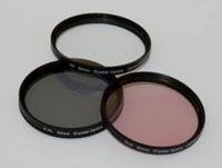 Figura 26 - Filme fotográfico Os sais de prata, quimicamente chamados de haletos ou halogenetos de prata, podem ser mais ou menos sensíveis à luz. Então, há filmes que exigem maior quantidade de luz para registrar as imagens. Outros permitem o captação com menos luz. A essa propriedade dá-se o nome de sensibilidade. Os filmes podem ser diferenciados quanto: Ao formato São variados os formatos de filme existentes no mercado. Cada formato tem a sua aplicação específica sendo necessária uma câmera apropriada para cada formato de filme. Actualmente, no meio fotográfico, designa-se por "pequeno formato" todos os tamanhos de filmes inferiores ao de 120, como "médio formato" os tamanhos de 120 e 127 e como "grande formato" todos os tamanhos iguais ou superiores a 4x5 polegadas, estes, normalmente dispostos em chapas. À cor Os filmes em cores negativos são destinados a elaboração de ampliações coloridas em papel. Os diapositivos (cromos ou slides) são filmes positivos coloridos para transparências (projecções) e serviços gráficos. Há poucos filmes que podem gerar um positivo preto e branco. Os filmes a preto e branco negativos produzem películas negativas para cópias fotográficas monocromáticas. À sensibilidade A sensibilidade dos filmes é indicada normalmente por números ISO, e as sensibilidades mais comuns no mercado são: ISO 32, 50, 64, 100, 125, 160, 200, 400, 800, 1600 e 3200. Filmes de baixa sensibilidade: ISO 32 a ISO 64. São ideais para o trabalho com muita luz (dias ensolarados, sol forte e flashes de alta potência). Em condições favoráveis, esses filmes produzem resultados de grão excepcionalmente fino, o que proporciona boa definição nos detalhes e bom contraste, mesmo em grandes ampliações. São indicados para fotografar retratos, paisagens e temas ligados à natureza. Filmes de média sensibilidade: ISO 100 a 400, são os mais populares para os objetivos gerais a que se propõe a emulsão em preto e branco. São filmes de granulação fina e ainda permitem trabalhos em condições de luz um pouco mais variadas. Indicados para dias ensolarados (ISO 100) ou nublados (ISO 200) e flashes de baixa potência (embutido na câmara). Filmes de alta sensibilidade: ISO 800 a ISO 3200. Os filmes desta categoria apresentam um aspecto nitidamente granulado quando ampliados. São ideais para trabalhos com pouca luz, como ambientes externos a noite, museus, teatros e casas de espetáculos em geral sem necessidade de uso de flash ou quando se necessita de alta velocidade para "congelar" o movimento (fotos de ação). Os filmes de ISO acima de 800 geralmente destinam-se a serviços profissionais, pois permitem alterações desses índices em condições extremas. Filtro fotográfico Um filtro fotográfico é um acessório de câmara fotográfica ou de vídeo que possibilita o manejo de cores e/ou a obtenção de efeitos de luz pela sua inserção no caminho óptico da imagem.