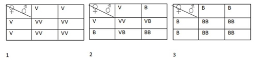 O cruzamento entre as linhas puras (VV x BB) originou uma descendência F1 uniforme, genotipicamente VB e com um fenótipo cor-de-rosa. A autopolinização de F1, originou 25% de plantas com flores vermelhas, 50% de plantas com flores cor-de-rosa e 25% de plantas com flores brancas, resultantes dos genótipos VV, VB, BB. Geração F3