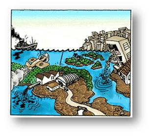 A poluição da água está associada a diversos factores: . Ao aumento da população . Ao desenvolvimento urbanístico . E à expansão industrial. Os mares, rios e lagos têm vindo a ser utilizados como um gigantesco caixote do lixo, acreditando-se que grandes massas de água tudo diluem e tudo dispersam a uma velocidade suficiente para evitar qualquer poluição. A poluição da água pode ter várias origens, tais como biológica, térmica, sedimentar e química. A poluição das Águas é a responsável: . Pela morte de muitos animais através das marés negras provocadas pelo derrame de petróleo; através dos resíduos de águas de lavagens de barcos que contêm detergentes e restos de óleos, esgotos, descargas poluentes de fábricas para rios e ribeiros, dos adubos químicos e dos pesticidas que ao infiltrarem-se na terra poluem as águas subterrâneas que irão desaguar em rios e lagos. . A acumulação de lixo no solo polui as águas subterrâneas. Deitar lixo para nas margens de rios contribui para a poluição das águas. . Transmissão de doenças pode ser igualmente factores de contaminação por doenças transmitas por mosquitos, como paludismo, malária, doença do sono, febre-amarela. Pode conter parasitas como verminoses, enquanto a escassez da água pode gerar ou potenciar doenças como a lepra, tuberculose, tétano e difteria. As águas poluídas por efluentes líquidos industriais podem causar contaminação por metais pesados que geram tumores hepáticos e de tiróide, alterações neurológicas, dermatoses, rinites alérgicas, disfunções gastrointestinais, pulmonares e hepáticas. A dengue é uma doença que se propaga somente na água. Porém, essa água tem que de estar parada e limpa para a criação do insecto. Às vezes, a água, que parece limpa, contém vírus, bactérias e parasitas (microrganismos patogénicos), que só podem ser vistos ao microscópio. Eles causam doenças como Hepatite, Disenteria, Cólera, Esquistossomose e muitas outras, prejudicando a nossa saúde.