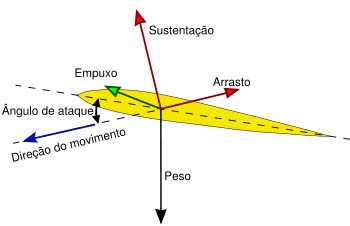 Esquema das quatro forças da aerodinâmica, actuando na asa de um avião. A aerodinâmica é o estudo do movimento de fluidos gasosos, relativo às suas propriedades e características, e às forças que exercem em corpos sólidos neles imersos. De uma forma geral a aerodinâmica, como ciência específica, só passou a ganhar importância industrial com o surgimento dos aviões e dos automóveis pois estes precisavam se locomover tendo o menor atrito possível com o ar pois assim seriam mais rápidos e gastariam menos combustível. O estudo de perfis aerodinâmicos, ou aerofólios, provocou um grande salto no estudo da aerodinâmica. Neste início o desenvolvimento da aerodinâmica esteve intimamente ligado ao desenvolvimento da hidrodinâmica que apresentava problemas similares, e com algumas facilidades experimentais, uma vez que já havia tanques de água circulante na época embora não houvesse túneis de vento. Forças da aerodinâmica da aviação Peso O peso é uma força que é sempre dirigida para o centro da terra: trata-se da força da gravidade. A magnitude desta força depende de todas as partes do avião, mais a quantidade de combustível, mais toda a carga (pessoas, bagagens, etc.). O peso é gerado por todo o avião. Mas nós podemos simplesmente imaginá-la como se actuasse num único ponto, chamado centro de gravidade. Em voo, o avião gira sobre o centro de gravidade, e o sentido da força do peso dirige-se sempre para o centro da terra. Durante um voo, o peso do avião muda constantemente à medida que o avião consome combustível. A distribuição do peso e do centro de gravidade pode também mudar, e por isso o piloto deve constantemente ajustar os controlos, ou transferir o combustível entre os depósitos, para manter o avião equilibrado. Sustentação Para fazer um avião voar, deve ser gerada uma força para compensar o peso. Esta força é chamada sustentação e é gerada pelo movimento do avião através do ar. A sustentação é uma força aerodinâmica ("aero" significa ar, e " dinâmica" significa movimento). A sustentação é perpendicular (em ângulo recto) ao sentido do voo. Tal como acontece com o peso, cada parte do avião contribui para uma única força de sustentação, mas a maior parte da sustentação do avião é gerada pelas asas. A sustentação do avião funciona como se actuasse num único ponto, chamado centro de pressão. O centro de pressão é definido tal como o centro de gravidade, mas usando a distribuição da pressão em torno de toda a aeronave, em lugar da distribuição do peso. Arrasto À medida que o avião se move através do ar, há uma outra força aerodinâmica presente. O ar resiste ao movimento do avião, e esta força de resistência é denominada arrasto (ou atrito). Tal como a sustentação, há muitos factores que afectam a magnitude da força de arrasto, como a forma do avião, a " viscosidade " do ar e a velocidade. E tal como acontece com a sustentação, consideram-se usualmente todos os componentes individuais como se estivessem agregados num único valor de arrasto de todo o avião. O sentido da força de arrasto é sempre oposto ao sentido do voo, e o arrasto actua através do centro de pressão. Quando um avião aumenta o ângulo de ataque, aumenta também a sustentação; mas aumenta igualmente o arrasto. Um avião que vá aumentando gradualmente o ângulo de ataque acaba por atingir um ponto em que a sustentação não consegue contrariar o efeito resultante das outras forças e entra em perda. É por este fato que, na fase de descolagem de um aeromodelo, não se deve fazê-lo subir em ângulo muito acentuado. Empuxo Para superar o arrasto, a maioria de aviões tem algum tipo de propulsão para gerar uma força chamada empuxo. A intensidade da força de empuxo depende de muitos factores associados com o sistema de propulsão: . O tipo de motor; . O número de motores; . O ajuste da aceleração; . A velocidade. O sentido da força de empuxo depende de como os motores estão colocados no avião. Na figura mostrada acima, dois motores a jacto estão posicionados sob as asas, paralelos à fuselagem, com a força actuando ao longo da linha central da aeronave. Em alguns aviões (tal como o Harrier) o sentido do impulso pode ser orientado para ajudar o avião a descolar numa distância muito curta. Para os motores de jacto, pode parecer confuso considerar que a pressão do avião é uma reacção ao gás quente que se escapa da turbina. O gás quente é expelido pela parte traseira, originando uma força de reacção em sentido contrário: o empuxo. Esta acção-reação é explicada pela terceira lei do movimento formulada por Newton. Os motores mais conhecidos são os motores de explosão(Ciclo Otto) e os motores a jacto (Ciclo Brayton). Mas também se utilizam motores eléctricos e motores de foguete. Os motores eléctricos e de explosão actuam usualmente por intermédio de hélices. Os motores a jacto e de foguete actuam pela força da reacção. Um planador é um tipo especial de avião que não tem nenhum motor. Alguma fonte externa da potência tem que ser aplicada para iniciar o movimento. Os aviões de papel são um exemplo óbvio, mas há muitos outros tipos de planadores. Alguns planadores são pilotados e rebocados para o alto por um outro avião, e a seguir são deixados livres para deslizar em distâncias longas antes de aterrar. Uma vez no alto, a energia cinética é responsável pelo impulso, mas ela para se manter gasta energia potencial. No entanto os planadores recorrem também a uma outra fonte de energia disponibilizada pela natureza: as correntes de ar ascendente que fazem o planador ou avião ganharem energia potencial sem perda de energia cinética e assim se manterem mais tempo no ar sem uso de motores. Tecnologias Aeronáuticas Militares