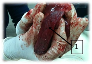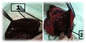 Legenda: 1 – Septo inter-ventricular 3 – DISCUSSÃO3.1 – Como interpreta os dados que obteve ao estudar a circulação cardíaca? Ao interpretar os dados que obtivemos ao estudar a circulação cardíaca, cheguamos à conclusão que a água injectada na artéria aorta e na artéria pulmonar não circulou. Isto aconteceu porque o sangue é bombeado por estas artérias (a artéria pulmonar conduz o sangue venoso aos pulmões e a artéria aorta transporta o sangue arterial para todo o corpo) fazendo com que as válvulas sigmóides fechem quando o sangue é bombeado, impedindo o seu retrocesso para os ventrículos. Já, a água que é injectada na veia cava sai pela artéria pulmonar. Isto porque a água, tal como o sangue no seu trajecto, vai passar para a aurícula direita, a válvula auriculoventricular abre e a água segue para o ventrículo direito. De seguida, a válvula bicúspide (auriculoventricular) fecha, e a válvula sigmóide abre, a água bombeada, segue pela artéria pulmonar e esta última válvula fecha-se fazendo com que esta não possa retroceder ao coração. A água injectada na veia pulmonar sai pela artéria aorta. Esta entra na aurícula esquerda, a válvula tricúspide abre e a água segue para o ventrículo esquerdo, fechando a válvula tricúspide e abrindo a válvula sigmóide, esta é bombeada pela artéria aorta, fechando-se esta última permitindo o não retroceder da água ao coração. 3.2 – A partir das observações que efectuou, refira: 3.2.1 – em que sentido abrem e fecham as diferentes válvulas. As válvulas auriculoventriculares (válvula bicúspide e tricúspide) abrem para os ventrículos, fazendo com que o sangue passe para estes e não retroceda para as aurículas, pois fecham-se de seguida. As válvulas sigmóides, também abrem para os ventrículos, fazendo com que o sangue siga o seu percurso e não regresse ao coração, pois estas fecham-se de seguida. 3.2.2 – uma hipótese sobre o trajecto do sangue. O sangue venoso proveniente de todo o corpo, entra na aurícula direita pelas veias cavas. Quando esta se encontra cheia de sangue, contrai, a válvula bicúspide abre, e o sangue entra para o ventrículo direito. De seguida, a válvula auriculoventricular fecha, os ventrículos contraem-se e a válvula sigmóide abre, o sangue é bombeado pela artéria pulmonar para os pulmões e esta última válvula fecha-se. Depois, o sangue venoso ao passar nos pulmões é oxigenado transformando-se em sangue arterial. Este sangue é conduzido pelas veias pulmonares até á aurícula esquerda. Quando esta fica cheia de sangue, contrai, a válvula tricúspide abre e o sangue passa para o ventrículo esquerdo, fechando-se de seguida esta última válvula. Os ventrículos contraem-se, a válvula sigmóide abre e o sangue é bombeado sob alta pressão e elevada velocidade pela artéria aorta, para todas as partes do corpo, e por fim, a válvula sigmóide fecha. E assim sucessivamente. 3.3 – Compare a espessura das paredes dos ventrículos. Como interpreta as diferenças observadas? A comparação que podemos estabelecer entre a espessura de ambos os ventrículos, é que, o ventrículo direito possui menos espessura que o ventrículo esquerdo. Isto verifica-se porque o ventrículo direito bombeia o sangue venoso, pela artéria pulmonar, para os pulmões, exercendo menos pressão que o sangue que é bombeado pelo ventrículo esquerdo, justificando-se a sua espessura mais fina. Já no ventrículo esquerdo, é o contrário. O sangue arterial vai ser bombeado pelo ventrículo esquerdo sob grande pressão, seguindo pela artéria aorta para todo corpo. Se o ventrículo esquerdo não fosse mais grosso este poderia rebentar, matando o ser humano. 3.4 – Justifique não ocorrer mistura de sangues no coração observado. No coração observado não se verificou mistura de sangues devido ao septo interventricular que divide o ventrículo direito (onde passa sangue venoso) do ventrículo esquerdo (onde passa sangue arterial). Se este septo não existisse, o ser humano poderia ter problemas cardíacos e respiratórios, podendo chegar a morrer. 3.5 – Descreva o trajecto do sangue no circuito pulmonar referindo a actuação das válvulas cardíacas. O sangue venoso é bombeado pelo ventrículo direito, seguindo pela artéria pulmonar até aos pulmões onde o sangue vai ser oxigenado, transformando-se em sangue arterial, rico em oxigénio. De seguida, este segue pelas veias pulmonares até á aurícula direita, onde mais tarde vai ser bombeado para todo o corpo. O sangue não retrocede aos ventrículos nem ás aurículas devido a umas válvulas ali existentes, que fecham impedindo esse efeito. As que ligam as aurículas aos ventrículos denominam-se por válvulas auriculoventriculares (bicúspide (lado direito do coração) e tricúspide (lado esquerdo do coração)) e as que ligam os ventrículos às artérias chamam-se válvulas sigmóides.