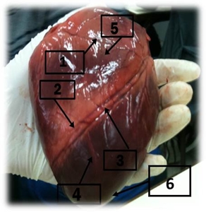 Legenda: 1 – Veias Carótidas 2 – Tecido Adiposo 3 – Sulco Ventricular 4 – Ventrículo Esquerdo 5 – Ventrículo Direito 6 - Miocárdio