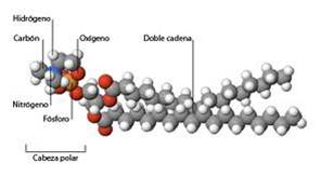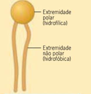 Fig.7 Representação da molécula de fosfolípido Estas moléculas são anfipáticas, pois orientam a extremidade com afinidade para a água para o meio intracelular e extracelular e outra extremidade hidrofóbica (sem afinidade para a água) está orientada para o lado interno da membrana, formando assim uma bicamada de fosfolípidos.