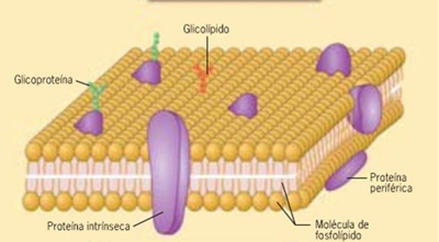Fig.9 Revestimento da bicamada fosfolipídica por proteínas As proteínas têm funções enzimáticas de transporte e transmissão de mensagens e de acordo com o lugar que ocupam podem ser classificadas em: proteínas periféricas ou extrínsecas e proteínas integradas ou intrínsecas. As proteínas periféricas localizam-se à superfície da membrana enquanto que as proteínas integradas estão localizadas entre os fosfolípidos e podem atravessar por completo a bicamada. Estas proteínas, além de enzimas, são também proteínas capazes de transportar substâncias ou proteínas receptoras de sinais do meio externo. Com o aparecimento do microscópio electrónico, confirmou-se este modelo. No entanto, este modelo não era capaz de explicar a passagem de moléculas polares (água, aminoácidos, monossacarídeos) através da membrana. Se a camada de lípidos fosse contínua, não seria possível que estas substâncias passassem entre a membrana. Com o avanço das investigações, verificou-se que este modelo possuía informações não compatíveis com novos dados. Verificou-se que as proteínas não revestiriam toda a superfície da bicamada fosfolipídica assim como quando a membrana era sujeita a ações enzimáticas, a camada fosfolipídica danificava-se mais facilmente do que as proteínas. Algumas das proteínas também eram de remoção mais fácil do que outras. Estes dados, serviram para comprovar que na membrana também existem poros, por onde as substâncias são transportadas.