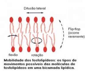 Fig.11 Modelo de Mosaico Fluido O modelo do Mosaico Fluido é assim denominado devido ao facto de a membrana plasmática ser uma estrutura flexível e também devido à grande fluidez das moléculas que o constituem, dado que estas têm movimento. Os movimentos das moléculas podem ser laterais ou de flip-flop. Os movimentos laterais ocorrem quando as moléculas fosfolipídicas trocam a sua posição com outras que se encontram na mesma camada. São os movimentos mais frequentes. Os movimento de flip-flop ocorrem quando as moléculas fosfolipídicas realizam movimentos transversais e mudando assim de camada.