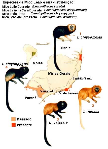 . O Mico Leão Dourado . O Mico Leão de Cara Dourada . O Mico Leão Preto . O Mico Leão de Cara Preta As causas para esta extinção são bem Conhecidas. As principais causas são elas o trafico de animais e como não podia deixar de ser, a destruição de habitats(Ósmicos vivem em florestas). Mas estas não são as únicas causas, também a caça e a sua separação (separação por grupos pois este animal é monógamo, uma vez formado um casal, mantém-se fiel e separação de machos e de fêmeas) causaram a redução drástica da população de Mico Leão durante os últimos 50 anos. Segundo as estimativas da população actual existem aproximadamente : . 1000 Indivíduos para Mico Leão Dourado . 6000 a 15.500 indivíduos para Mico Leão de Cara Dourada . 1000 Indivíduos para o Mico Leão preto . Por fim existem apenas 400 indivíduos para o Mico Leão de cara preta. O Mico Leão Dourado está a levar esta espécie à extinção. Actualmente, resta apenas um único local de preservação deste animal: a Reserva Biológica de Poço das Antas, no Município de Silva Jardim (Brasil). Nesta imagem é possível observar a distribuição actual e passada destas quatro espécies que se encontram em vias de extinção. (esta imagem situa-se no Brasil)