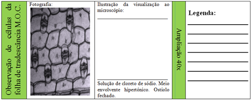1-Objectivos: A experiência a seguir relatada teve como objetivos: - Observar os estomas de uma folha, como são constituídos e de que modos reagem as diferenças de concentração de sais no meio envolvente; 2-Introdução: Suporte Teórico: Trocas gasosas nas plantas: As plantas são seres vivos que necessitam de realizar trocas gasosas nomeadamente na realização da fotossíntese. Deste modo, as plantas necessitam de possuir nas suas folhas e/ou nos caules estruturas que possibilitem a entrada de dióxido de carbono e a saída de oxigénio. Assim as plantas possuem os estomas com o objetivo da realização das trocas gasosas entre si e o meio envolvente. Os Estomas: Os estomas são pequenas aberturas ou poros localizados na epiderme da maioria dos órgãos aéreos das plantas, sendo mais abundantes nas folhas e caules jovens. O complexo estomático é formado por uma abertura, o ostíolo, que contacta com a câmara estomática, delimitada por duas células-guarda. O estoma funciona como via principal para as trocas gasosas (dióxido de carbono, oxigénio e vapor de água). O movimento de abertura e fecho do estoma é regulado ao nível das células-guarda. Variações na pressão de turgescência destas células, devidas ao movimento osmótico da água e ao fluxo de iões, determinam a abertura ou fecho dos estomas. Quando a turgescência das células-guarda aumenta, o estoma abre, e quando a turgescência destas células diminui, ocorre o movimento de fecho do estoma. As células-guarda são sensíveis a estímulos endógenos (ex. ácido abcísico) e a estímulos exógenos (ex. luz, dióxido de carbono, temperatura e humidade). O movimento de fecho dos estomas é estimulado pelo aumento acentuado da concentração de ácido abcísico, que pode estar associado a situações de stress hídrico. O efeito desta fito-hormona sobre os estomas é reversível. Em algumas espécies vegetais, a abertura dos estomas é estimulada pela presença de luz, encontrando-se estes fechados em condições de obscuridade. O aumento da concentração de dióxido de carbono na câmara estomática conduz ao fecho dos estomas. O movimento de fecho dos estomas pode também ser acionado por um grande aumento da temperatura. Em situações de carência hídrica, os estomas fecham, reduzindo a perda de água por transpiração. Processo de abertura e fecho dos estomas:  O estoma fecha quando há saída de água do interior das células guarda para o meio envolvente devido a este ser hipertónico em relação ao meio interior. O estoma abre quando há entrada de água para o interior das células guarda devido a concentração de sais ser maior no seu interior, assim o meio interior é hipertónico em relação ao meio envolvente. Nota: É importante referir que o movimento da água se efetua a favor do gradiente de concentração por osmose e que a entrada de sais se realiza por transporte ativo. Os estomas possuem uma parte interior com características mais rígidas o que origina o ostíolo quando as células guarda ficam túrgidas.  DOC. 1 – Ilustração legendada referente aos estomas e as trocas gasosas; 3- Material Utilizado: -Microscópio. -Lâminas. -Lamelas. -Vidros de relógio. -Solução aquosa de cloreto de sódio. -Agulha de dissecção. -Bisturi. -Conta-gotas. -Pinça. -Água destilada. -Solução de Ringer. 4- Procedimento Experimental: Observação de células da epiderme e dos estomas da folha do lírio: 1 - Preparou-se a bancada de trabalho de forma organizada; 2 - Numa lâmina colocou-se uma gota de cloreto de sódio aquoso; 3 - Com uma pinça e o bisturi retirou-se um fragmento da epiderme da folha do lírio; 4 - Com a agulha de dissecção colocou-se essa amostra sobre a solução aquosa de cloreto de sódio; 5 - Cobriu-se a preparação com a lamela e levou-se a observação no microscópio. 6 - O mesmo possesso foi repetido com água destilada e com a solução de Ringer. 5-Resultados: Observação da epiderme da folha do lírio ao M.O.C. | Ilustração da visualização ao microscópio: ___________________________________ _________________________________ Solução de cloreto de sódio. Meio envolvente hipertónico. Ostíolo fechado. | Ampliação 40x | Legenda: | Ilustração da visualização ao microscópio: _________________________________ _________________________________ Água destilada. Meio envolvente hipotónico. Ostíolo aberto. | Ampliação 40x | Legenda: | Ilustração da visualização ao microscópio: _________________________________ _________________________________ Solução de Ringer. Meio envolvente hipertónico. Ostíolo fechado. | Ampliação 40x | Legenda: | Experimentei também a visualização da epiderme da folha de tradescância.   6-Discussão dos resultados: Para possibilitar a visualização do ostíolo aberto e fechado utilizou-se a solução de cloreto de sódio, a solução de Ringer e a água destilada. Verificou-se que com a solução de Ringer e com o cloreto de sódio o ostíolo fechava uma vez que a água no interior das células guarda saía diminuindo a pressão de turgescência destas o que provocava o fecho do ostíolo. Já com a água destilada o ostíolo ficava aberto uma vez que a água entrava para o interior das células guarda aumentado a pressão de turgescência. Obtive os resultados esperados com uma boa visualização dos ostíolos abertos com a água destilada e fechados com o cloreto de sódio e a solução de Ringer. 7-Conclusão: Com esta atividade laboratorial foi possível verificar que o ostíolo tem um papel importante ao nível das trocas gasosas da planta e na realização da fotossíntese. Verifiquei que quando o interior das células guarda é hipertónico em relação ao meio envolvente a água entra para o seu interior fazendo com que estas células fiquem turgidas provocando a abertura do ostíolo. Pelo contrário, quando o interior das células guarda é hipotónico em relação ao meio envolvente a água saí do se
