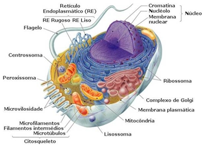 Figura 1 – Célula Eucariótica Animal e os seus constituintes Actualmente, a teoria celular assenta em três pressupostos: 1º-A célula é a unidade básica estrutural e funcional de todos os seres vivos (isto é, todos os seres vivos são constituídos por células, onde ocorrem os processos vitais); 2º-Todas as células provêm de células pré-existentes; 3º-A célula é a unidade de reprodução, de desenvolvimento e de hereditariedade dos seres vivos. As células apresentam uma grande diversidade morfológica e funcional. Podem ser classificadas em células procarióticas (células mais simples, que não apresentam núcleo individualizado e perfeitamente organizado) e células eucarióticas, que apresentam uma organização estrutural mais complexa, nomeadamente no que se refere ao núcleo, que aparece completamente organizado e delimitado por um invólucro. Tanto as células vegetais como as células animais, que vão ser estudadas na presente actividade laboratorial, são células do tipo eucariótico.