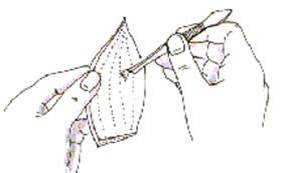 Figura 3 – Retirar a epiderme interior das túnicas da cebola Colocámos uma gota de azul-de-metileno numa lâmina, para que o mesmo funcionasse como meio de montagem. Posteriormente, colocámos um fragmento que tínhamos cortado anteriormente em cima da gota de azul-de-metileno. Cobrimos o fragmento com a lamela, primeira fazendo um ângulo de 45º, e depois, baixando a lamela vagarosamente, até que esta o estivesse a cobrir totalmente. Com a ajuda do papel absorvente, limpámos o excesso de azul-de-metileno que se encontrava na lâmina. Posteriormente, colocámos a lâmina na platina, de modo a que se procedesse à sua observação microscópica. Utilizámos um poder de ampliação total de 100x. Registámos numa folha de papel a observação que estávamos naquele momento a visualizar. No entanto, decidimos que também seria importante utilizar uma objectiva com um poder de ampliação maior. Ficámos com um poder de ampliação total de 400x. Procedemos à sua esquematização, tal como já tinha acontecido na visualização anterior. Depois da visualização das células vegetais utilizando como meio de montagem o azul-de-metileno, repetimos as mesmas, mas desta vez utilizando como meios de montagem o corante vermelho-neutro, e posteriormente, o soluto de lugol. Terminámos a observação das células vegetais utilizando como meio de montagem a água. Procedimento B: Para a execução da observação das células de origem animal, começámos por colocar numa lâmina, uma gota de azul-de-metileno, com a ajuda do conta-gotas. Depois disso raspámos levemente um palito na superfície dorsal da língua. Posteriormente, fizemos com que a parte do palito que tinha sido raspada na língua entrasse em contacto com o corante azul-de-metileno, que se encontrava na lâmina. Cobrimos a preparação com a lamela, utilizando o processo já em cima referido (primeiro fazendo um ângulo de 45º, e depois, baixando vagarosamente, até que a lamela assentasse totalmente na lâmina). Mais uma vez, com o papel absorvente, limpámos o excesso de azul-de-metileno que se encontrava na lâmina. Executámos visualizações com todos os poderes de ampliação disponíveis, mas só desenhámos a observação originada pelo poder de ampliação total de 400x. Resultados As seguintes imagens mostram os resultados obtidos na execução dos Procedimentos A e B, respectivamente. Nota: As seguintes imagens não estão à escala, sendo apenas uma interpretação dos resultados obtidos através da observação microscópica.