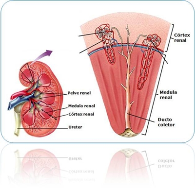 Cápsula de Bowman – zona inicial que se localiza na região cortical do rim. Aqui ocorre a filtração através do endotélio do capilar do glomérulo e da parede da cápsula, que impedem a passagem de células e macromoléculas. Tubo contornado proximal – imediatamente a seguir á cápsula de Bowman, é uma porção do tubo bastante enrolada e ainda localizada no córtex renal. As suas paredes realizam transporte activo de sais e nutrientes Tubo contornado distal – zona terminal do tubo urinífero. Aqui ocorrem importantes fenómenos de secreção, com transporte activo sobretudo de K+ e H+, o que mantém o pH sanguíneo adequado. Tubo colector – embora não fazendo parte do tubo urinífero, está aqui considerado devido a ainda ser um importante interveniente na formação da urina. Ansa de Henle – porção do tubo em forma de U, subdividida em zona descendente e ascendente, que mergulha na medula do rim. A porção descendente da ansa é permeável á água mas pouco permeável aos sais e á ureia, pelo que há uma concentração da urina. Controle Hormonal - ADH ADH significa - Hormônio anti-diurético (vasopressina). Aumenta a absorção de água pelos túbulos coletores. A secreção de ADH é inibida pelo álcool e pela cafeína.
