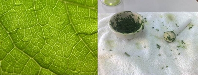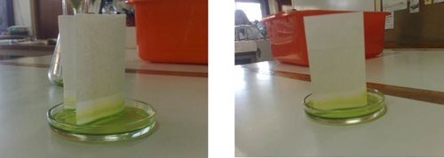Material utilizado: . Folhas de uma planta; . Funil; . Placa de Petri; . Álcool a 90%; . Areia fina; . Vareta; . Papel de filtro; . Almofariz; . Tesoura; Procedimento Experimental: 1. Cortámos as folhas em pedaços para dentro do almofariz. Junte areia e esmague com o pilão; 2. Adicionámos um pouco de álcool, agite com a vareta e filtre; 3. Vertermos o filtrado para uma caixa de Petri; 4. Introduzimos nesse filtrado um rectângulo de papel de filtro dobrado em ângulo; 5. Após o procedimento, aguardámos alguns minutos, observe o papel de filtro e registe as alterações que verificar; RESULTADOS OBTIDOS